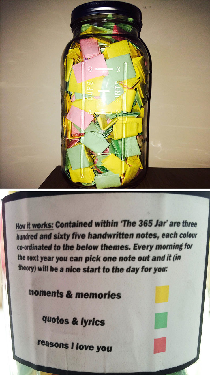 ▼15. 玻璃罐裝滿365張紙條,黃色是有關回憶、綠色是名言和歌詞、粉紅色則是愛你的理由。