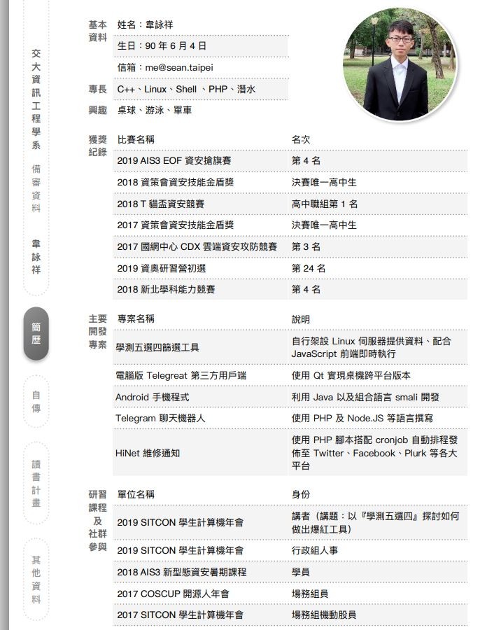 ▼韋詠祥就讀新北市清水高中,他大方公開長達37頁的備審資料,其中簡要的介紹了個人經歷與自傳,畫面清晰明瞭。雖然學測成績不到頂尖,但他對資工程式卻早有興趣。從國中起便自學程式,精熟C++、Linux、Shell和PHP,求學階段更曾幫校方處理資安問題。