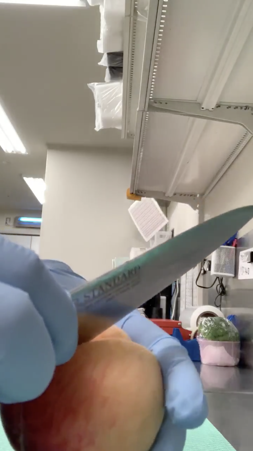▼2.沿著水蜜桃中間那條像臀部一樣的縫輕輕劃出一道開口,不用切太深,只要把表皮切開就好。