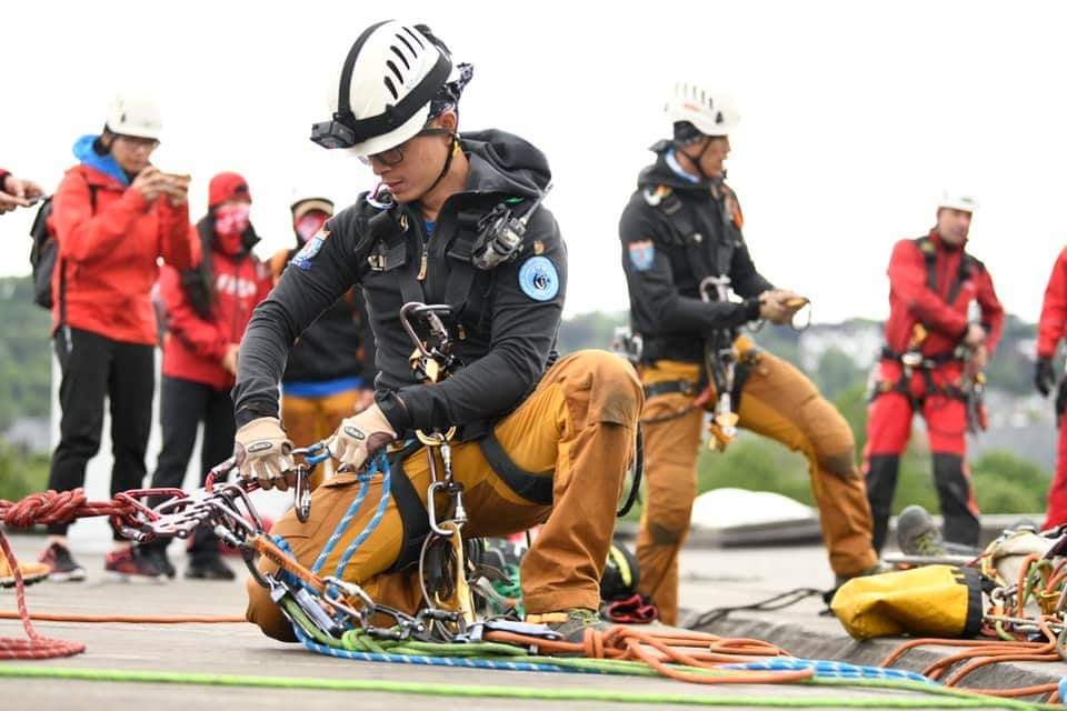 ▼高雄繩索救援隊KRRT,今年遠赴比利時參加GRIMPDAY賽事,GRIMPDAY是比利時消防隊員發起的繩索救援比賽,舉辦至今是第13年,參賽隊伍有台灣、美國、英國、加拿大、法國、德國等等超過15個國家,隊伍數量共計30隊,可說是全球規模最大的賽事,相當於繩索救援的奧運。
