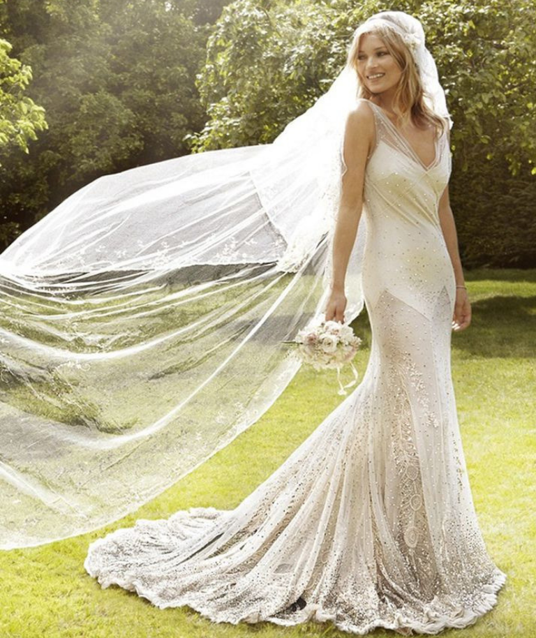 ▼英國名模凱特摩絲(Kate Moss)在婚禮時所穿的婚紗,是由她的老朋友 John Galliano 所設計,他是前 Dior 的設計師,波西米亞風格的禮服完全將她的好身材襯托了出來。