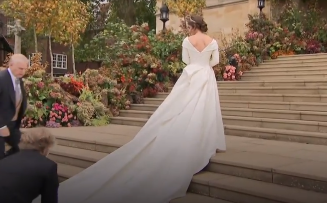▼英女王孫女尤金妮公主(Princess Eugenie)結婚時所穿的婚紗,由英國設計師 Peter Pilotto 和 Christopher de Vos 所設計。
