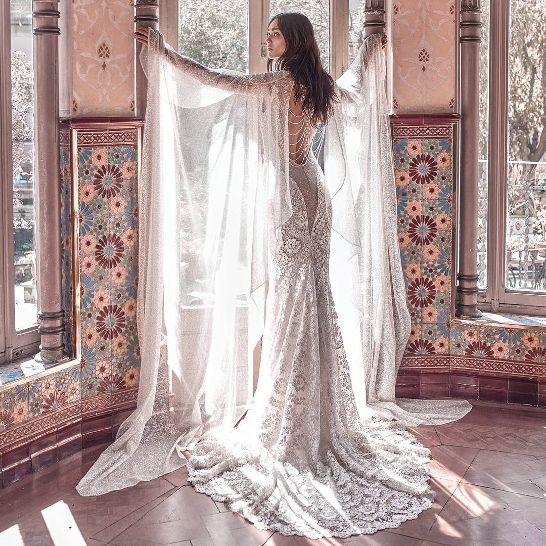▼以色列設計師 Galia Lahav 所設計出來的波西米亞風蕾絲連衣裙,利用超薄的刺繡來巧妙掩蓋新娘的身體,帶出了另一種神秘的美感!