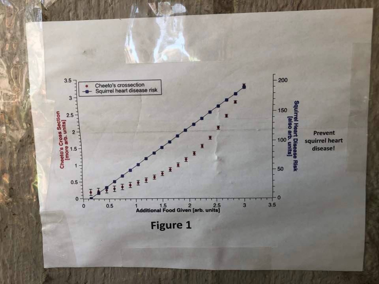 ▼師生們不停餵食奇多,除了導致奇多過重之外,也牽連到校園裡其他動物:由於奇多吃不完的食物,會被松鼠們拿去吃,導致松鼠們罹患心血管症狀。另一張圖表就顯示出,給奇多的食物跟校園裡松鼠們不健康的比例呈現正相關。