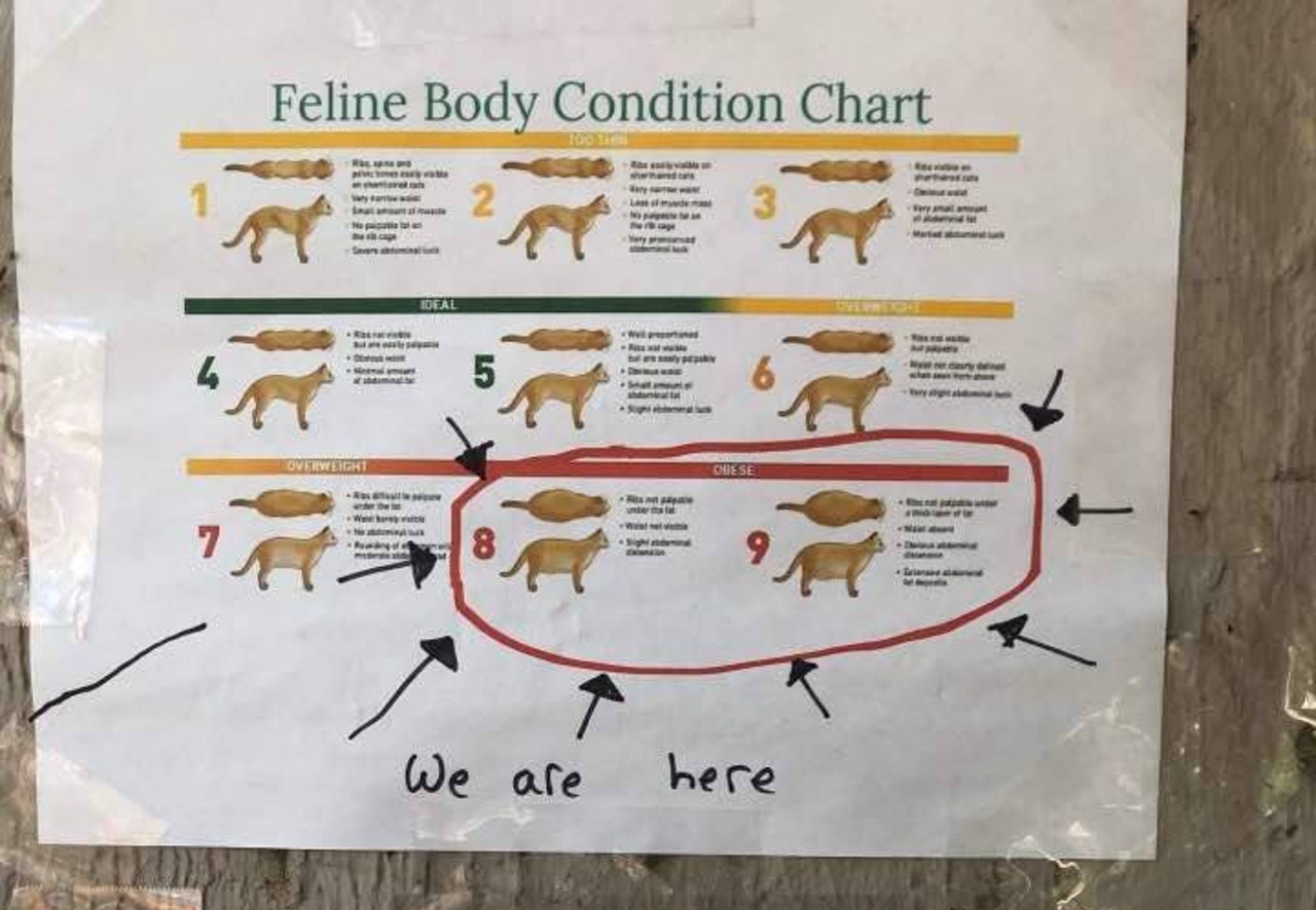 ▼公告中說明,物理系已經有指派同學專門餵養奇多,物理系的大家都很愛牠、會好好照顧牠,「牠已經太重了!為了牠的健康,不管牠再怎麼哀求都絕對不能餵牠!」還貼心地附上圖表說明,奇多的體重已經到達很不健康的程度。