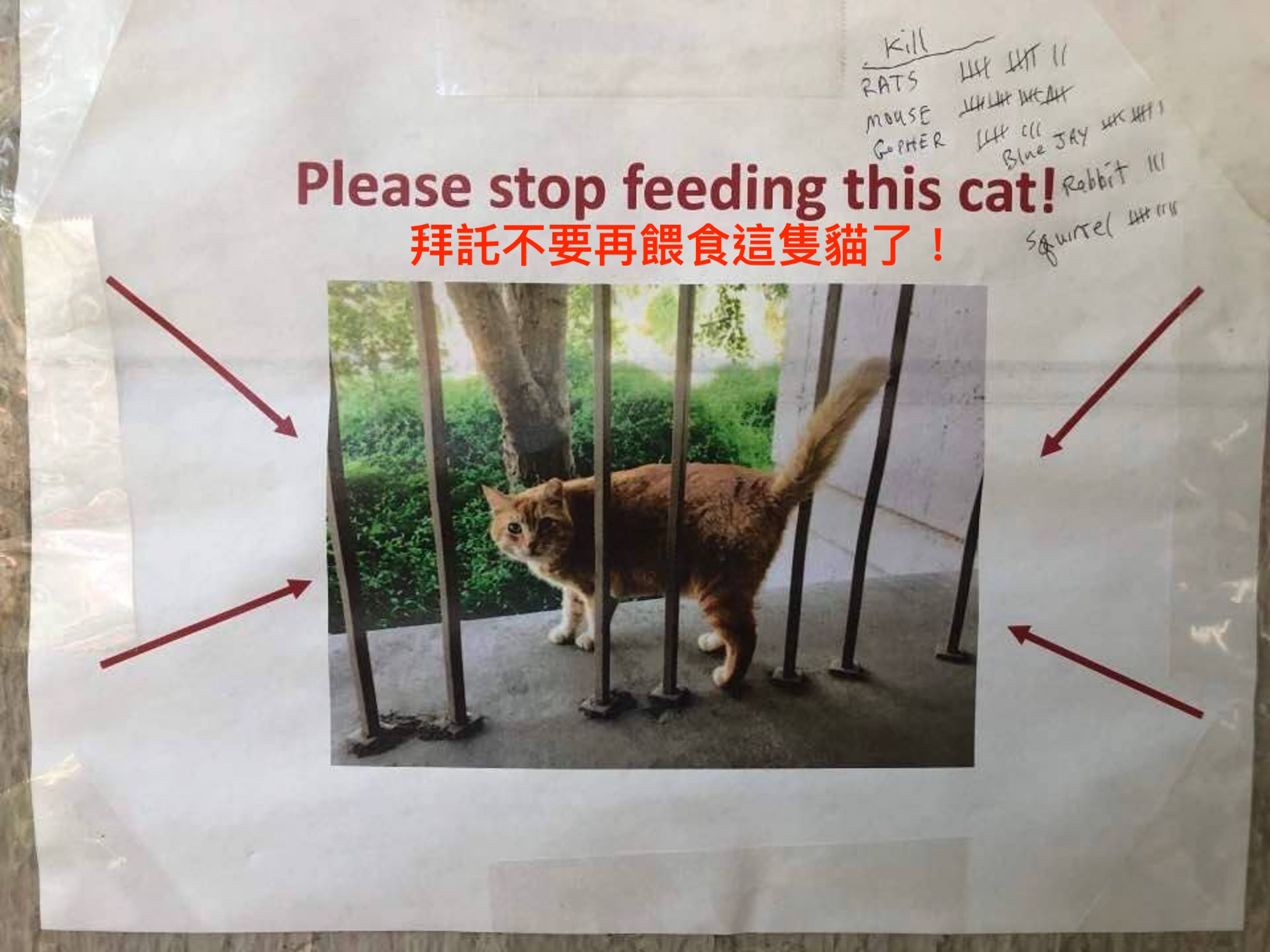 ▼負責照料奇多的學生看著奇多一天比一天圓,為了奇多的健康著想,只好在頒下「禁餵令」,在校園各處張貼「別再餵啦!」的公告。