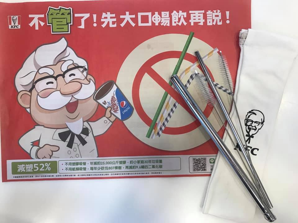 2019年06月12日為響應環保,政府將於7/1推行減塑政策,各大速食店也加入減塑行列。肯德基宣布即日起各門市全面停用塑膠吸管,鼓勵用餐民眾直接撕開封膜「用乾的」;此外,肯德基也祭出集點換飲料活動,消費者只需自備環保杯便能參與活動。
