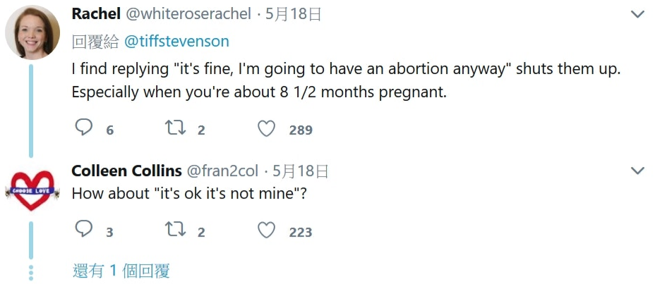▼「我覺得可以直接回對方『沒關係,反正我要拿掉寶寶了~』,尤其是你已經懷胎8個月半的時候,對方肯定會馬上閉嘴」。