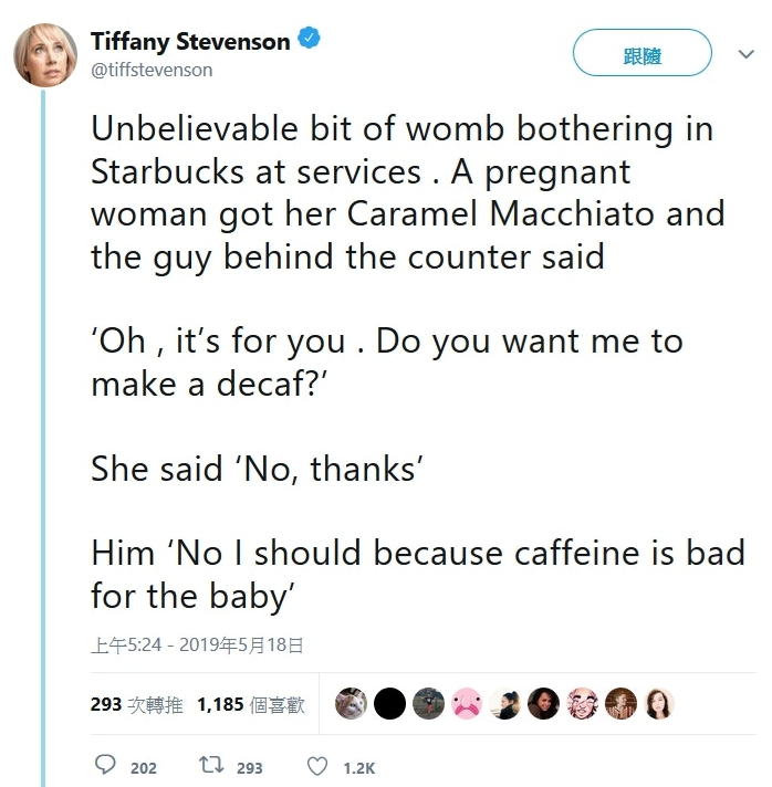 ▼史蒂文森表示當時那位孕婦點了焦糖瑪奇朵,面前的男店員發現她是孕婦後,當場神色尷尬地教育對方不應該喝咖啡。「這是你的嗎?你要我做一杯沒有咖啡因的嗎?」,那名女子非常感謝男店員的好意,但她清楚知道自己的咖啡因攝取量,表示自己不需要無咖啡因的飲品。