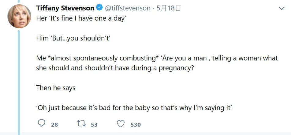 2019年06月12日孕婦不可以喝咖啡?星巴克一名男店員就因為這個理由而拒絕賣咖啡給懷孕的客人,整個過程也被英國喜劇演員史蒂文森(Tiffany Stevenson)目睹,讓她忍不住生氣PO網:「你是一個男人,竟然指點一個懷孕的女人該做什麼,不該做什麼?」。