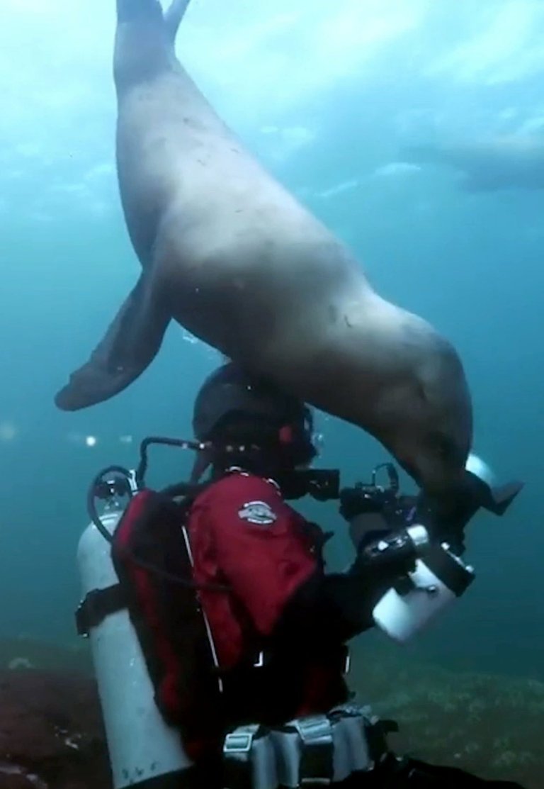 ▼這些海豹和海獅還會輕咬他們的頭、手和腳蹼,在牠們準備離開的時候,牠們露出了超無辜的表情。