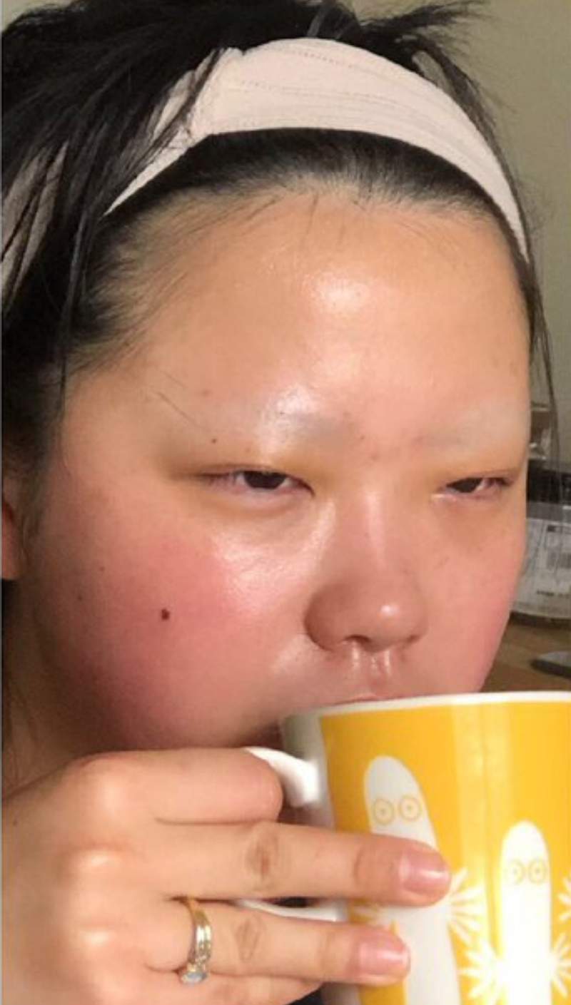 ▼她在推特上po出自己起床後剛剛做完護膚、迷迷糊糊喝咖啡的照片。為了不嚇到大家,還特別加上了「閱覽注意」幾個大字。