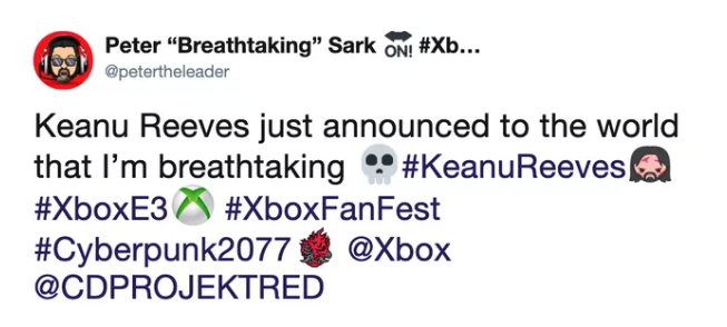2019年06月13日電玩迷都超期待的《電馭叛客 2077》(Cyberpunk 2077)日前在E3展宣傳,其中最令大家感到興奮的就是基努李維的驚喜站台!當他對著全場觀眾說「遊戲裡的世界將會讓大家很驚艷」時,一名狂粉的反應讓大家都歡呼拍手!