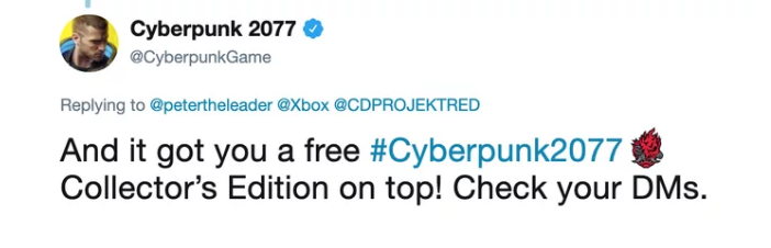 「然後你就獲得了收藏版的《電馭叛客 2077》!請查看私訊!」