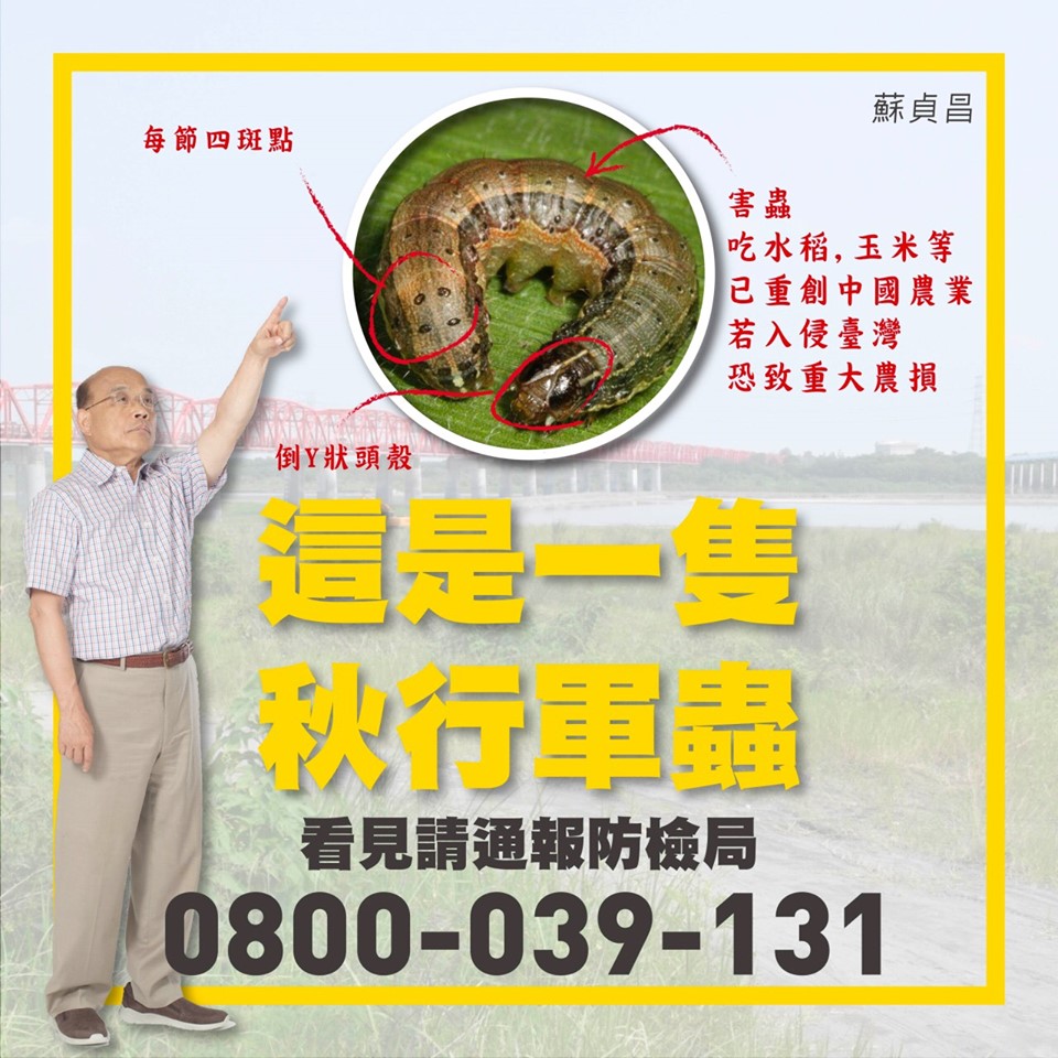 ▼此外為了鼓勵民眾積極通報,蘇院長也下了重要指示,趁著秋行軍蟲目前還是幼蟲階段,而從卵到成蟲只需要30天,必須在幼蟲到成蟲階段前就全部加殲滅,不能讓牠們留在國內。因此主動通報的民眾在經過判定確定後,將獲得1萬元的獎勵金額。