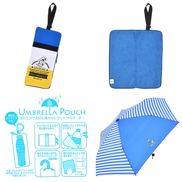 ▼摺傘用收納包和摺疊傘:內裡布擁有可吸水特性的摺傘用收納袋,讓你濕透的雨傘不會弄濕你的包包,沒有放置雨傘時還可以用來裝約500毫升的飲料瓶,讓瓶子外的水不會沾濕了包包,將拉鏈完全拉開還可以變成一條小抹布!而這把折疊傘也採用了唐老鴨的經典配色,無論晴天雨天都可以使用!