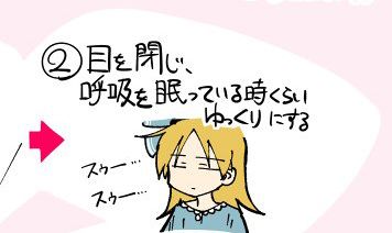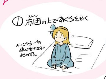 ▼這位漫畫家使用了自己漫畫中的角色「愛麗絲」來當成示範,首先第一個步驟就是在平坦的床上盤腿坐下,讓身體保持平穩不動的狀態。