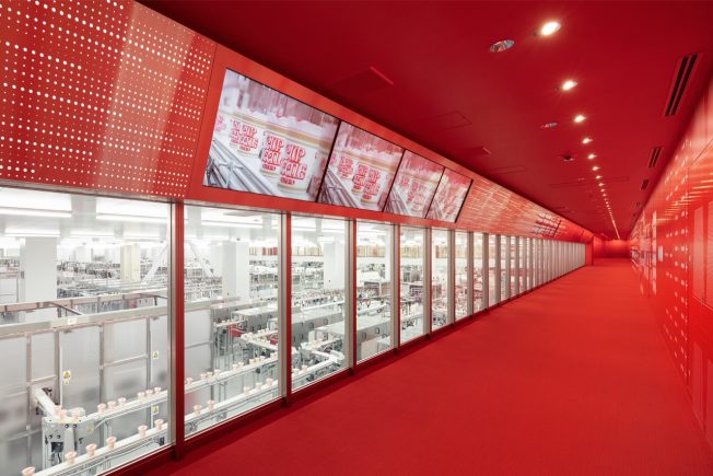 ▼進入工廠後,首先要穿過長長的走廊。走廊以醒目的紅色為主色調,看起來很有活力,與普通的工廠相比非常有特色。