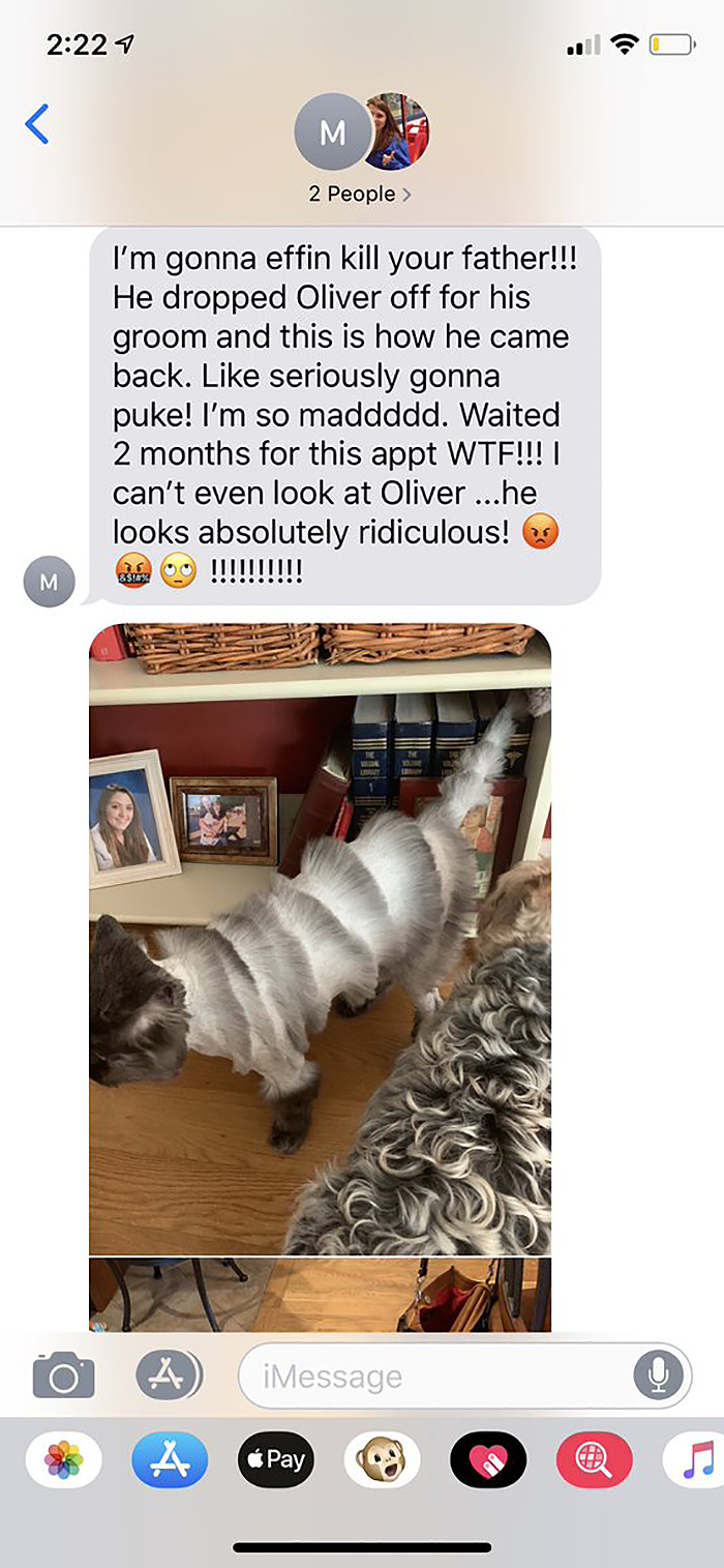 ▼網友Caitlin Christine在推特上分享了媽媽的簡訊截圖,媽媽說「我真的要被你爸爸氣瘋了!他把Oliver丟給了美容師,回來的時候竟然變成了這樣!我要暈倒了!要等兩個月的寵物美容最後是這樣,我簡直不敢正眼看Oliver,這個造型看起來真的太離譜了!」