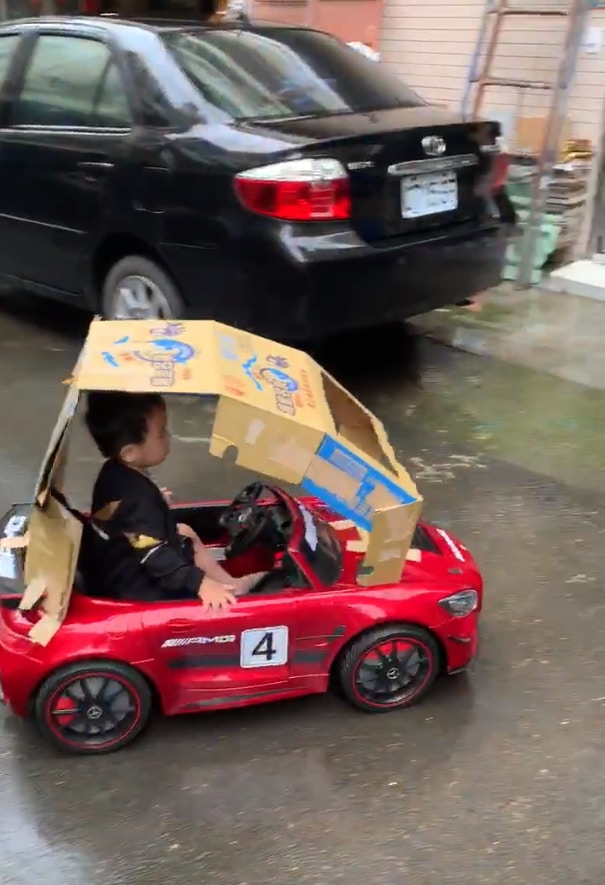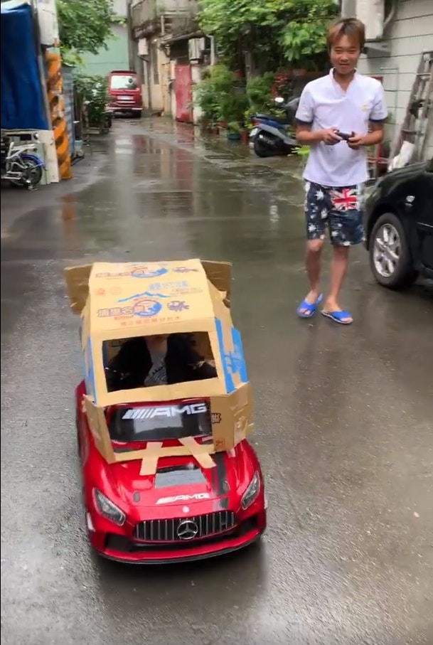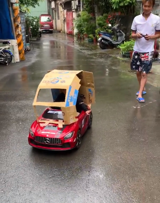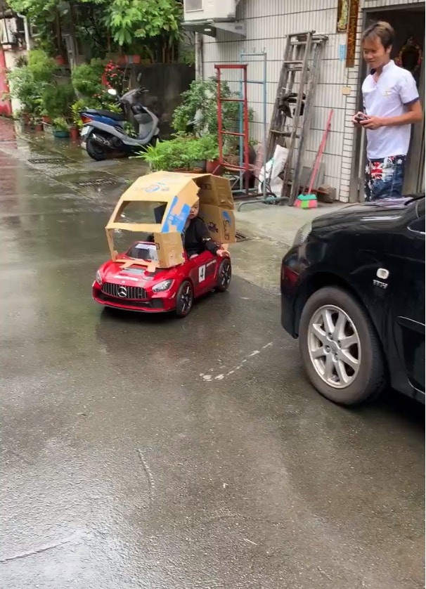 ▼從原po所分享的影片可以看到,當時天上下著毛毛雨,但兒子為了想要玩電動車,於是向爺爺撒嬌表示「下雨也要開賓士」。結果疼愛孫子的爺爺馬上在家裡找出了材料,用紙皮為孫子做了一個「敞篷」,滿足了孫子的願望。