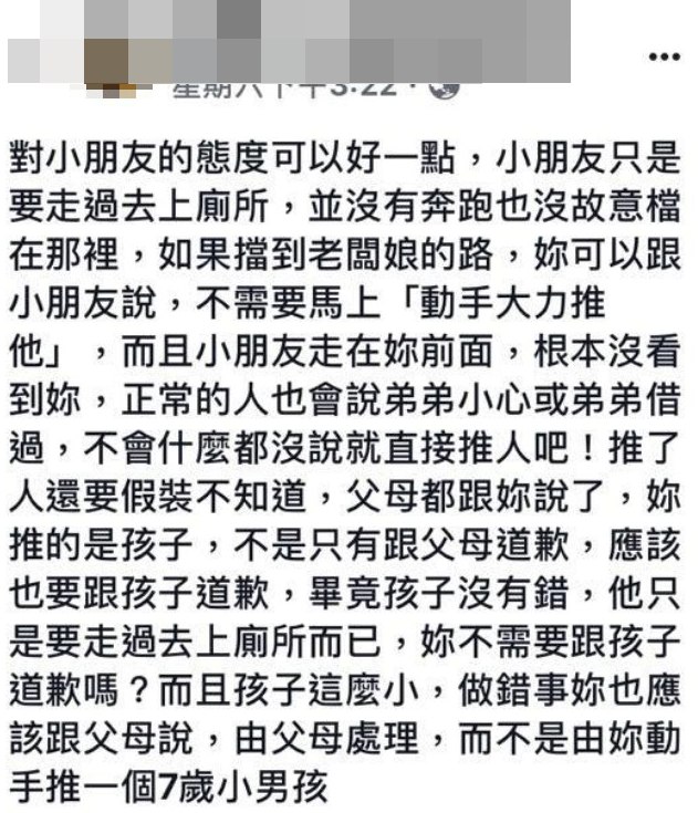 ▼那名女客人是一名媽媽,當天一家人用餐後,她就到店家的臉書專頁說孩子只是要去上廁所,也沒有故意擋道,沒想到店員卻一聲不吭推小孩,還假裝不知道,要求店員跟自己和孩子道歉,「妳可以跟小朋友說,不需要馬上動手大力推他。不能用說的嗎?一定要動手?」。