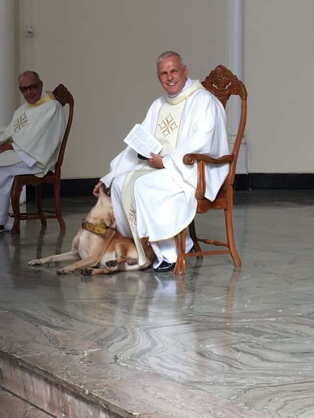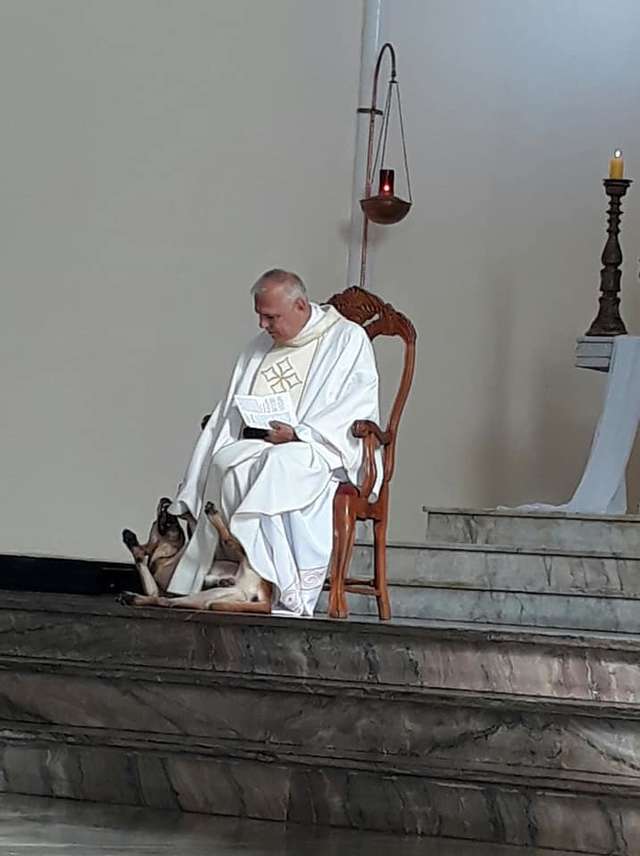 ▼當時大家正在詠唱聖歌,神父們坐在前面的椅子上。狗狗突然跑到José Geraldo Sobreira神父腳下撒嬌。牠狂搖尾巴,蹭來蹭去求摸摸,還把神父的祭衣當玩具,不停咬衣服下擺。