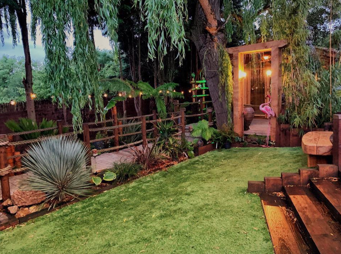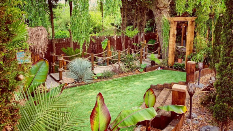 ▼Chris沒有園藝經驗,只能利用閒暇時間從頭學習相關知識,並利用晚上和週末的時間動工。現在他終於完成了這個大工程!挖地、改造草坪後,Chris用木材和繩索搭建了一座橋,橋周圍還有棕櫚樹、多肉植物。
