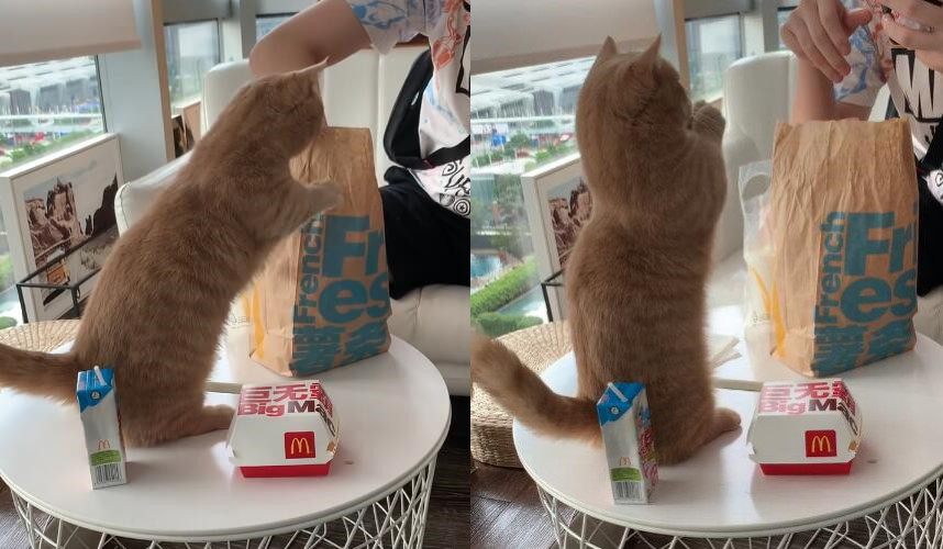 你的薯條好香哦~ 短腿喵秒變信徒「小手虔誠拜託」:給我一口嘛!