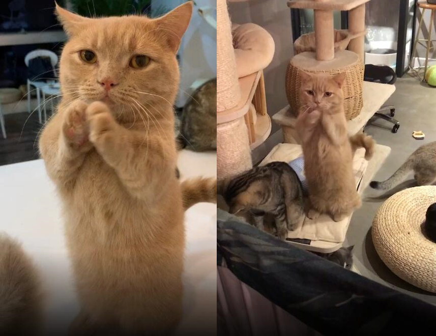 ▼據悉這只短腿喵名叫「旺財」,是咖啡廳裡的店貓,「拜託」技能是牠每天「騙吃騙喝」的法寶,可愛的模樣也吸引了超高人氣。