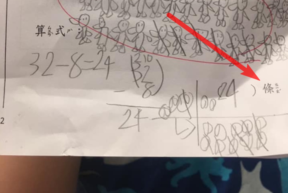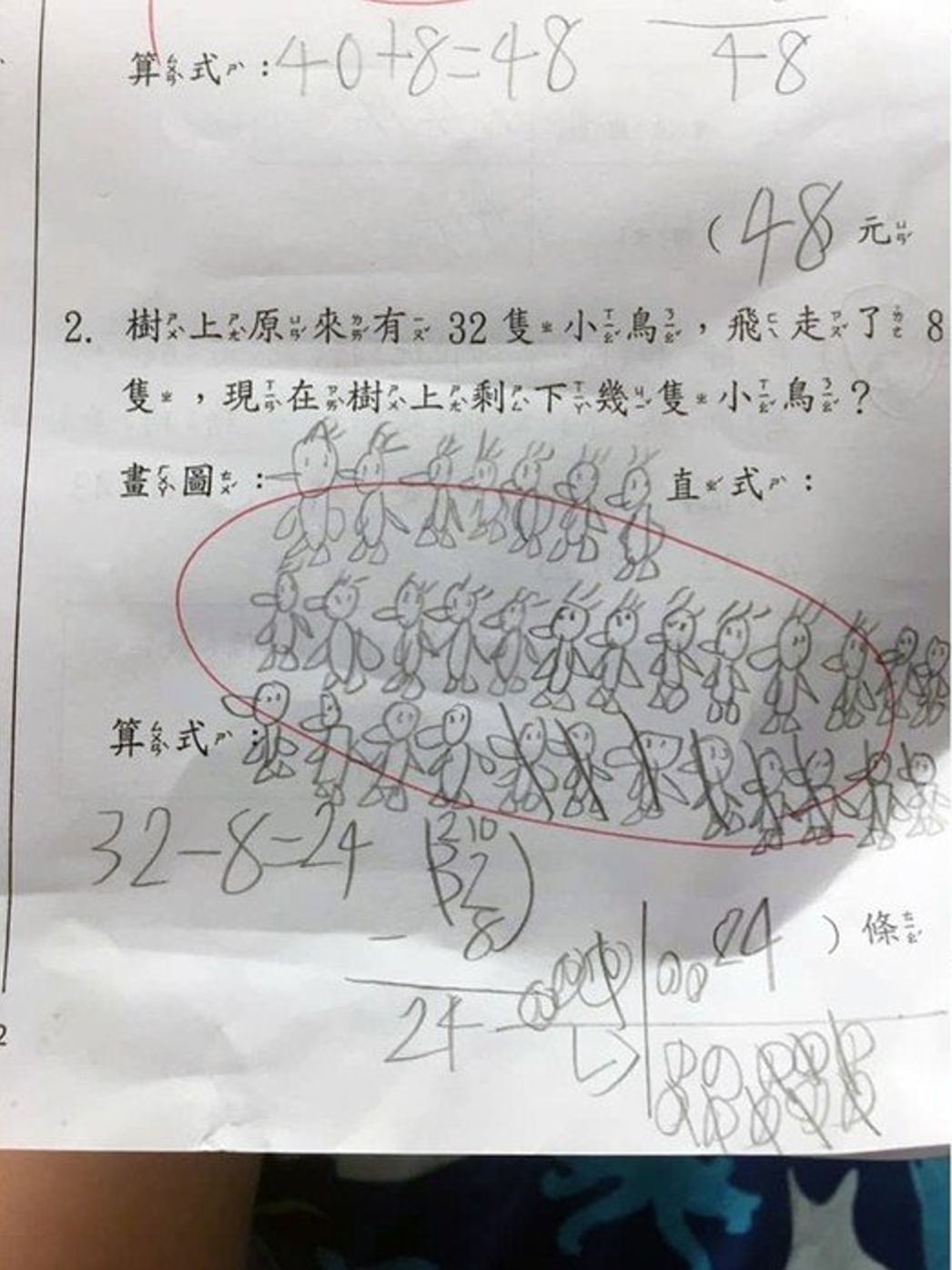 ▼只見考卷上這一題的題目是:「樹上原來有32隻小鳥,飛走了8隻,現在樹上剩下幾隻小鳥?」下方答題處還寫了一個「畫圖」,於是這位小朋友就認真的在考卷上畫出了32隻小鳥!