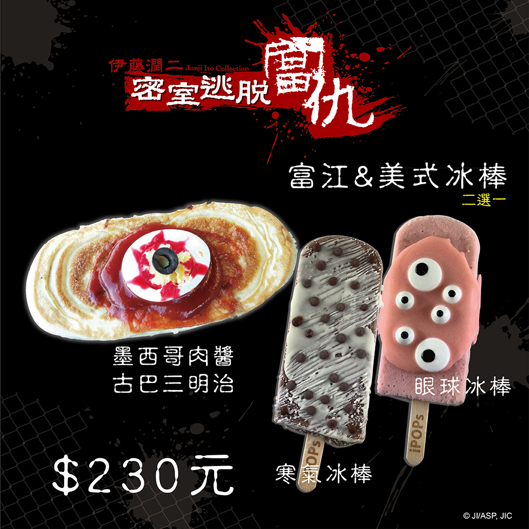 ▼5.創意商品:除了遊戲外,還有「驚嚇創意套餐」及各項周邊,如長得很獵奇的雙一三明治、富江肉乾等多項創意商品,一次滿足伊藤潤二粉絲的視覺味覺!