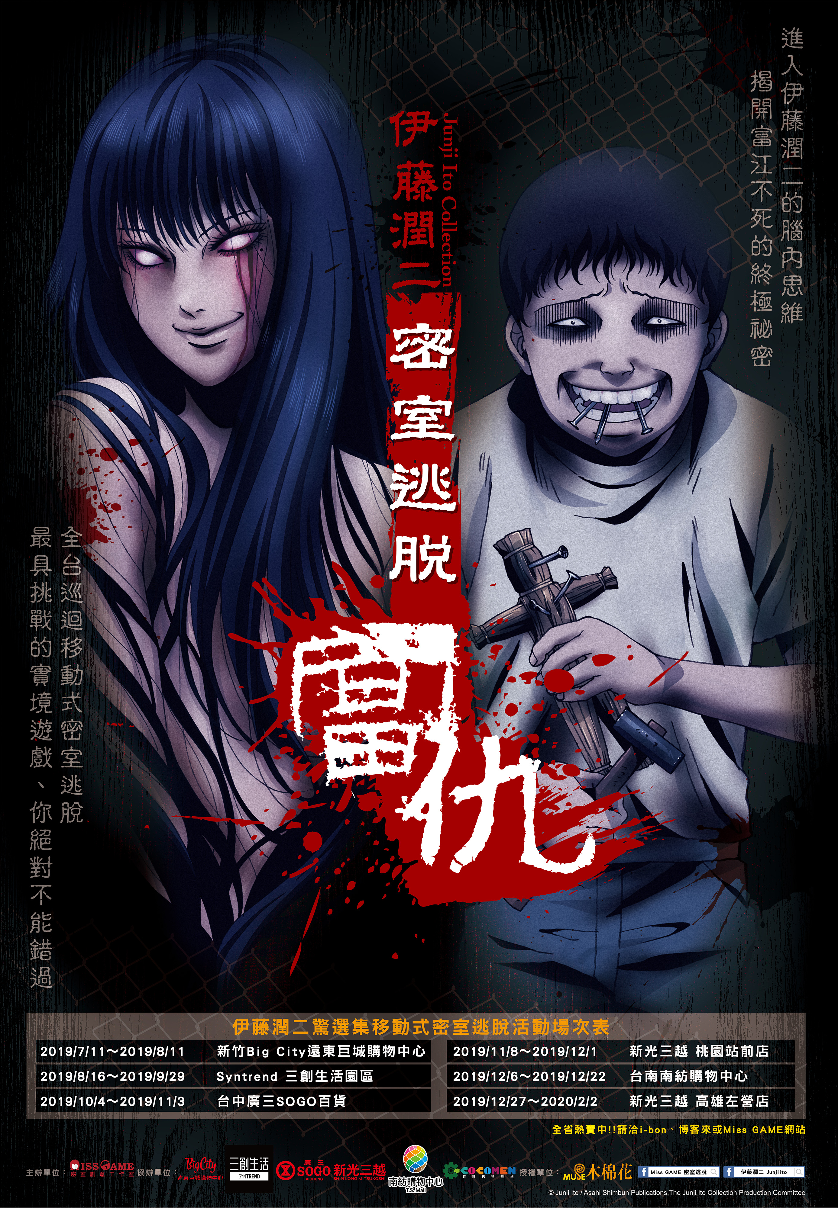 2019年06月24日伊藤潤二粉絲照過來!實境解謎遊戲公司「Miss Game密室逃脫」與伊藤潤二合作,將以伊藤老師筆下最著名的「富江」、「雙一」作為雙主角,推出全國首創貨櫃「移動式密室逃脫」遊戲,即將巡迴全台6大地區!