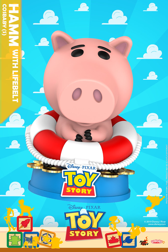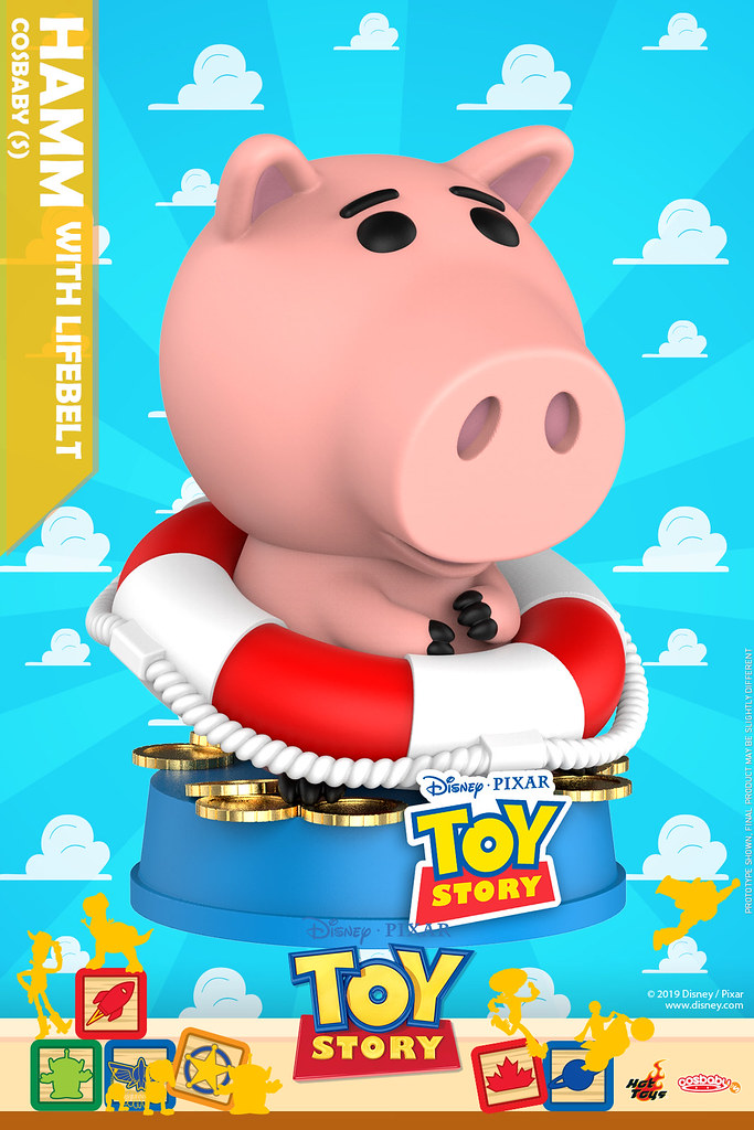 坐在救生圈上的火腿博士,在救生圈這款有著《玩總》的名牌座,在救生圈下面還有閃閃發光的金幣,不忘提醒你這隻小豬在電影裡其實是個存錢筒XD