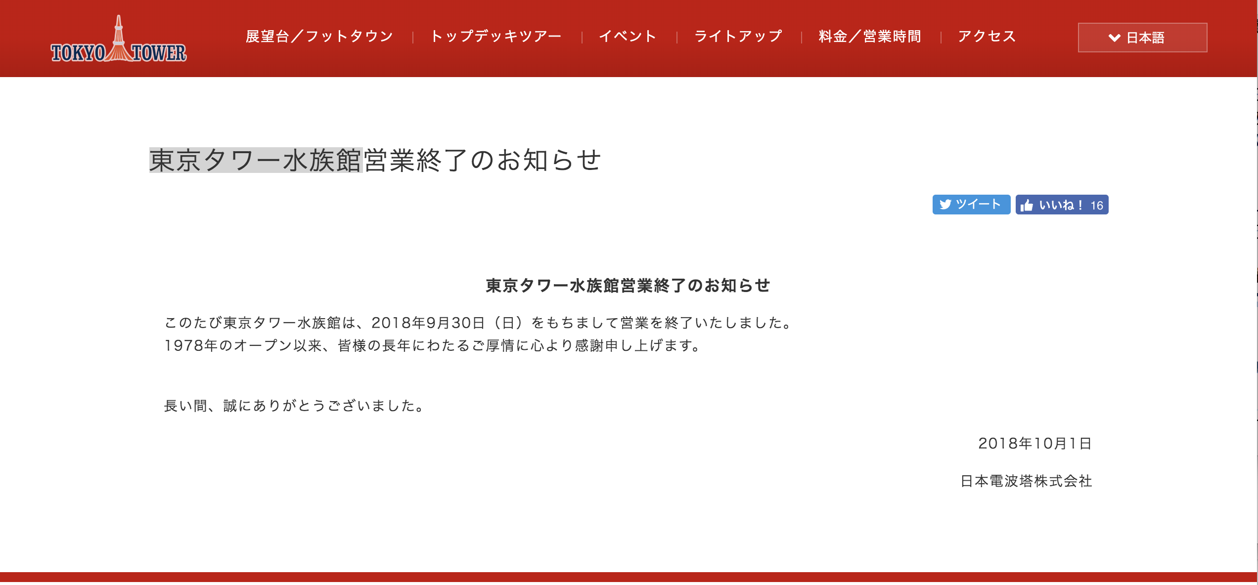 ▼「東京鐵塔水族館」從1978年開業起,度過了40個年頭;卻因經營不善,自去年9/30起停止營運,並於網站上貼出公告。