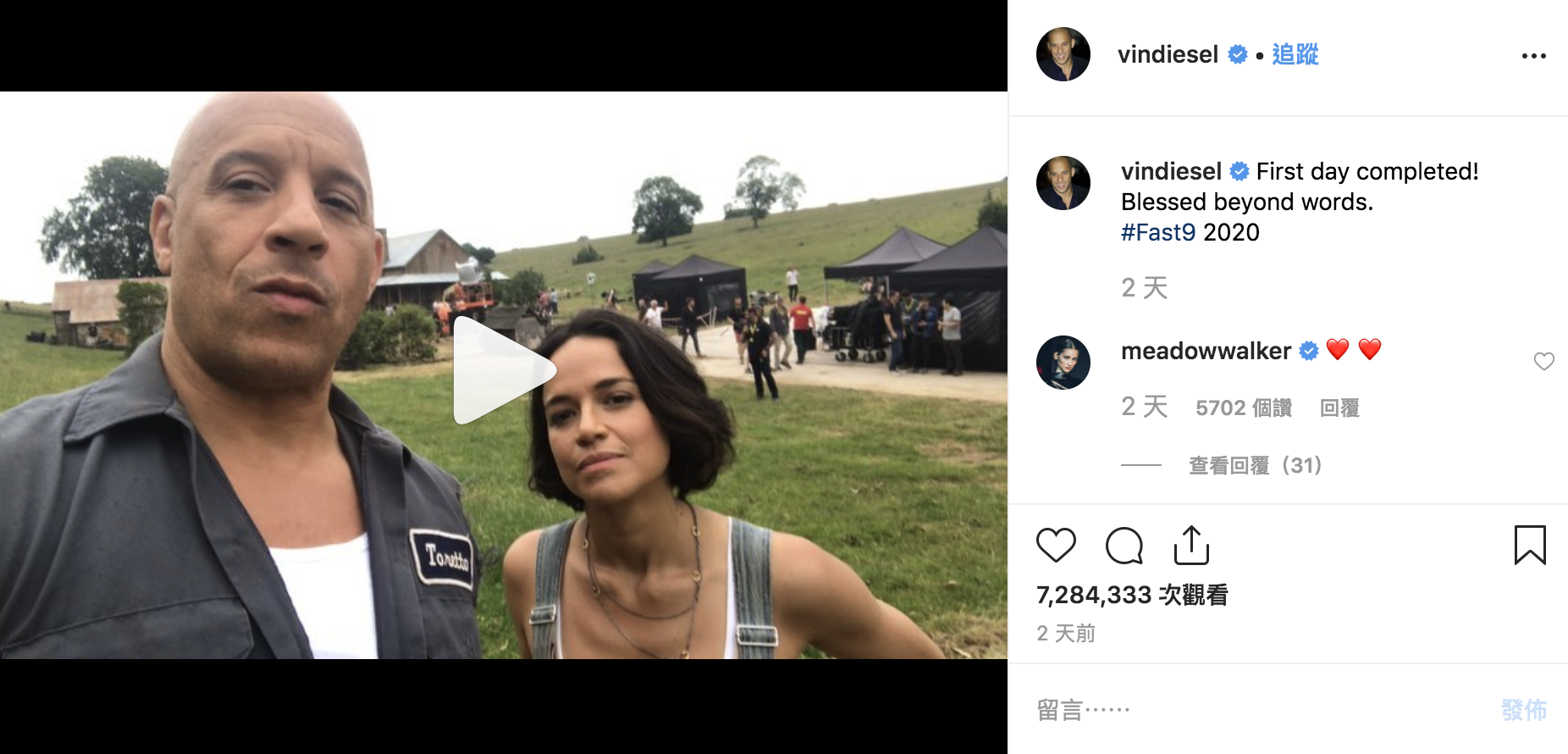 2019年06月27日電影《玩命關頭》系列因為夠刺激又夠爽,長期以來有不少忠實粉絲支持;但在主角之一的保羅沃克(Paul Walker)與世長辭後,《玩命關頭》系列作一波三折,直到日前(25日)「唐老大」馮迪索(Vin Diesel)在社群網站上傳一段片場的花絮,告知大家電影順利進行拍攝中。而這則貼文竟然還釣到保羅沃克的女兒梅朵(Meadow)前來留言,惹不少粉絲落淚。