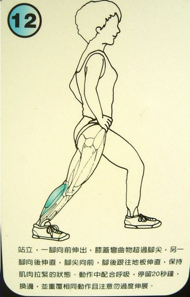 ▼12.站立,一腳向前伸出,膝蓋彎曲勿超過腳尖,另一個腳向後伸直,腳尖向前,腳後跟往地板伸直,保持肌肉拉緊的狀態。動作中配合呼吸,停留 20 秒鐘,換邊,並重覆相同動作且注意勿過度伸展。