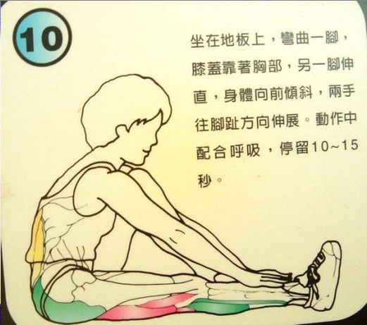 ▼10.坐在地板上,彎曲一腳,膝蓋靠著胸部,另一腳伸直,身體向前傾斜,兩手往腳趾方向伸展。動作中配合呼吸,停留 10 ~ 15 秒。