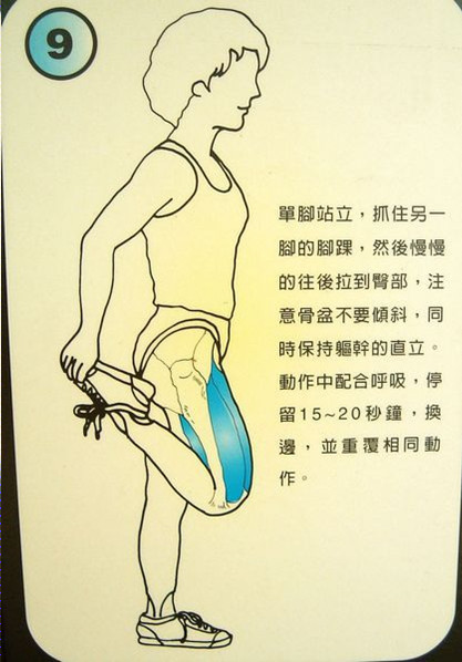 ▼9.單腳站立,抓住另一腳的腳踝,然後慢慢的往後拉到臀部,注意骨盆不要傾斜,同時保持身軀的直立。動作中配合呼吸,停留 15 ~ 20 秒鐘,換邊並重覆相同動作。