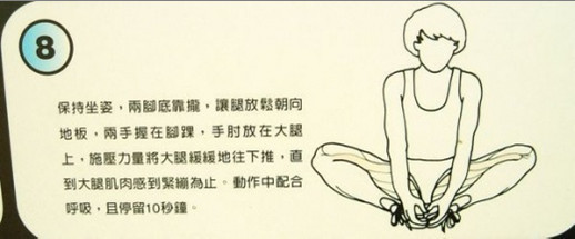 ▼8.保持坐姿,兩腳底靠攏,讓腿放鬆朝向地板,兩手握在腳踝,手肘放在大腿上,施壓力量將大腿緩緩地往下推,直到大腿肌肉感到緊繃為止。動作中配合呼吸,且停留 10 秒鐘。