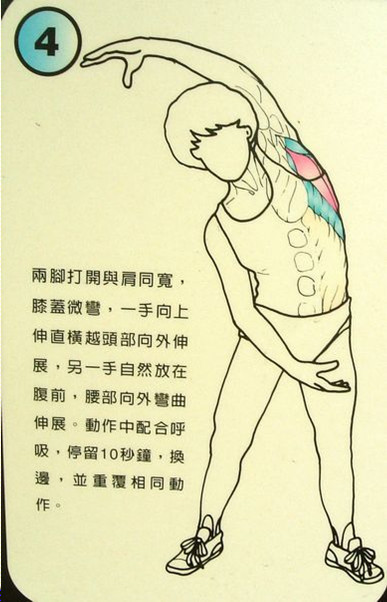 ▼4.兩腳打開與肩同寬,膝蓋微彎, 一手向上伸直橫越頭部向外伸展,另一手自然放在腹前,腰部向外彎曲伸展。 動作中配合呼吸,停留 10 秒後換邊,並重覆相同動作。