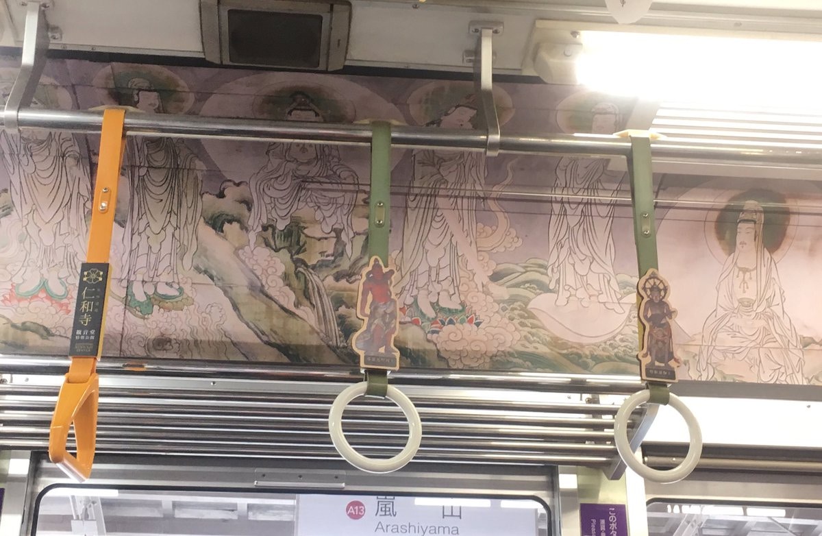 ▼原本不對外開放的「仁和寺觀音堂」,為了慶祝完成多年的維修,寺廟決定公開寺廟內的33座佛像以及375年前所留下的壁畫,當中也包括了千手觀音像的本尊在內!為了方便民眾到訪,寺廟才會聯同京都市觀光協會及JR西日本,將嵐電621形的622號列車進行改裝,讓更多人知道這件事。
