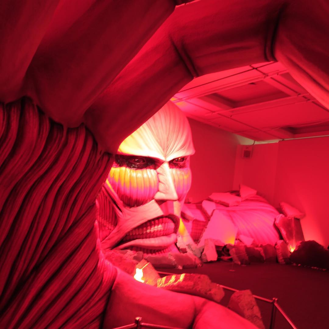 ▼更棒的是,策展單位還宣布將會完全還原進撃的巨人世界觀,放置1:1巨人模型與高達20公尺的超大螢幕,走進房間裡,環繞音響馬上傳出戰場上的吶喊聲,彷彿真的置身巨人世界中。(圖為2014年上野的展覽)