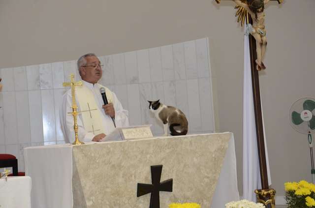 ▼有一次Junior跳到了神父的講桌上,神父沒有驅趕牠,牠全程氣定神閒,還開始舔毛。大家唱聖歌、唸祈禱詞,牠也沒有覺得不安。大概在牠看來,這些人都是自己的信眾,正在歌頌自己吧~