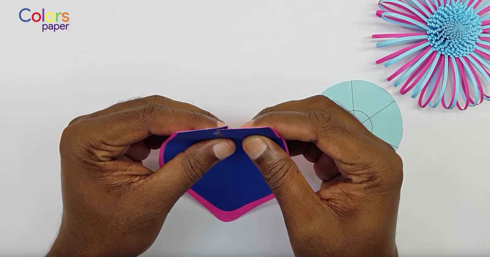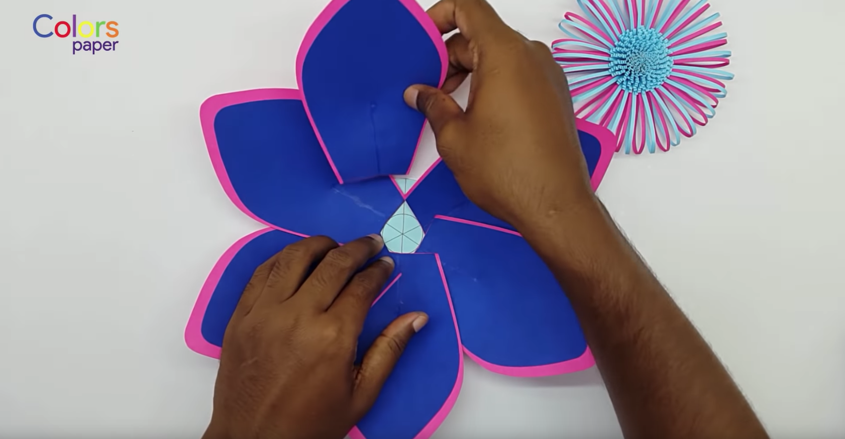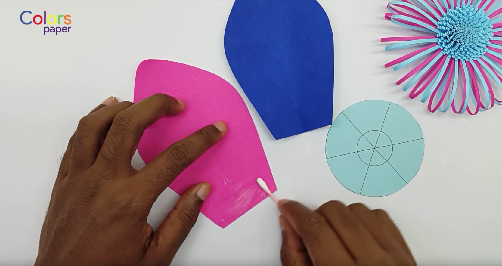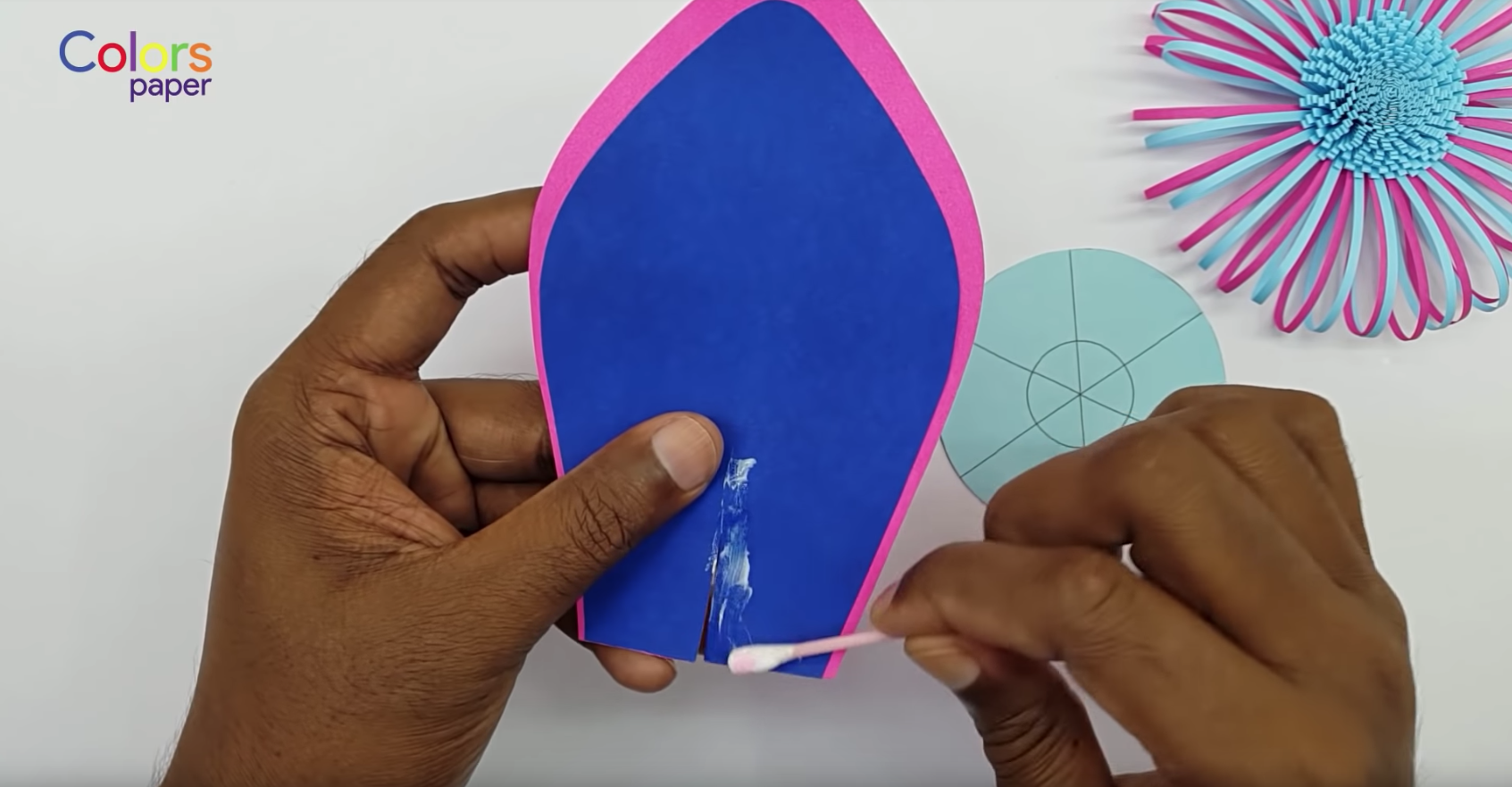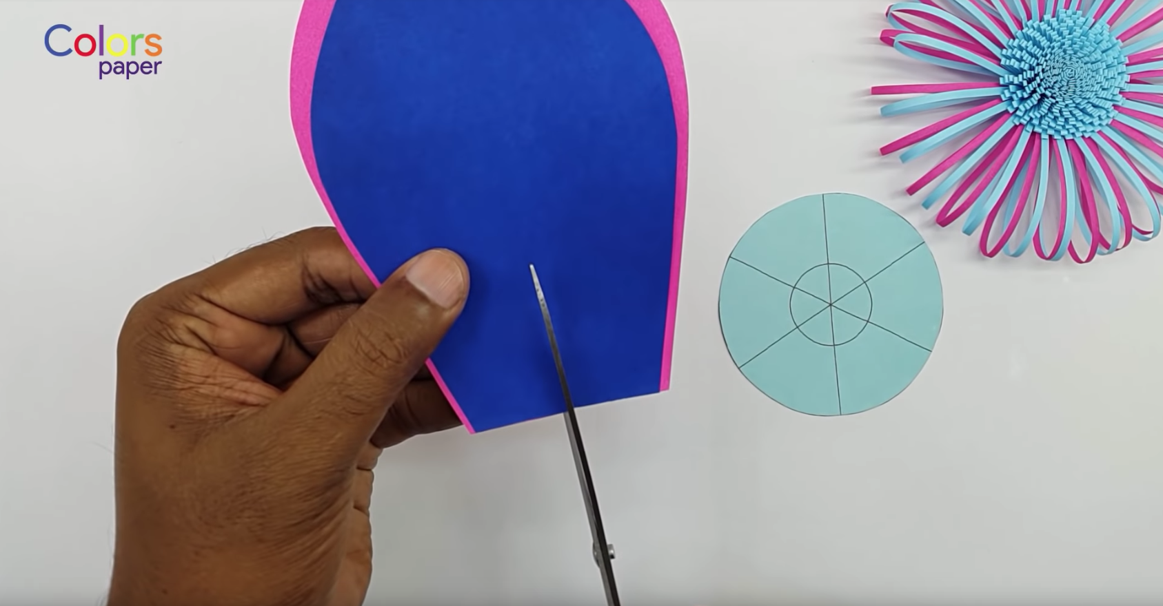 ▼藍色花瓣貼上粉紅色花瓣,剪一刀。