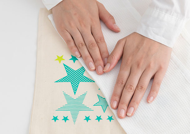 ▼最後在上方放一塊布,對著貼紙用力按壓,最後輕拍按壓貼紙就完成固定了!