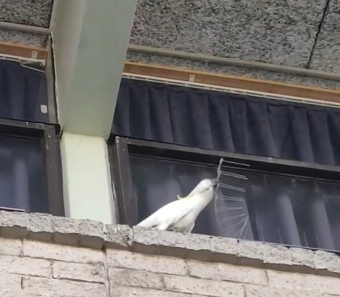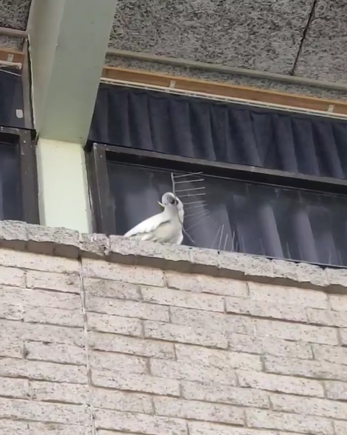 ▼這隻狂躁的鸚鵡站在一戶人家的窗檯上,用喙和腳將防鳥刺拆下來丟下去,可以說是非常囂張了。