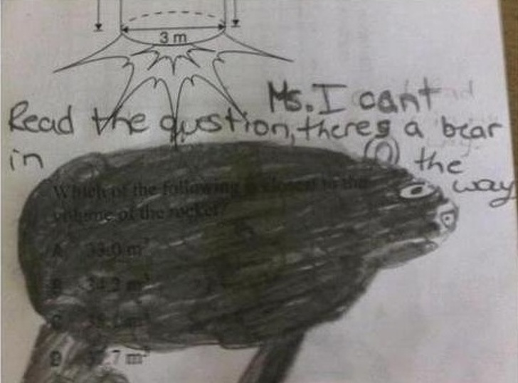 ▼「老師,我看不到題目,因為有一隻熊擋在那裡!」