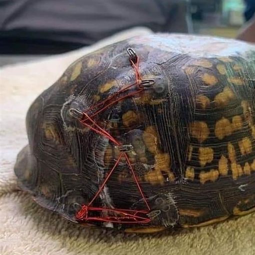 ▼動物救援人員會將烏龜裂開的龜殼先黏起來,之後用內衣後的鐵扣幫助金屬線固定龜殼,讓龜殼更快癒合。