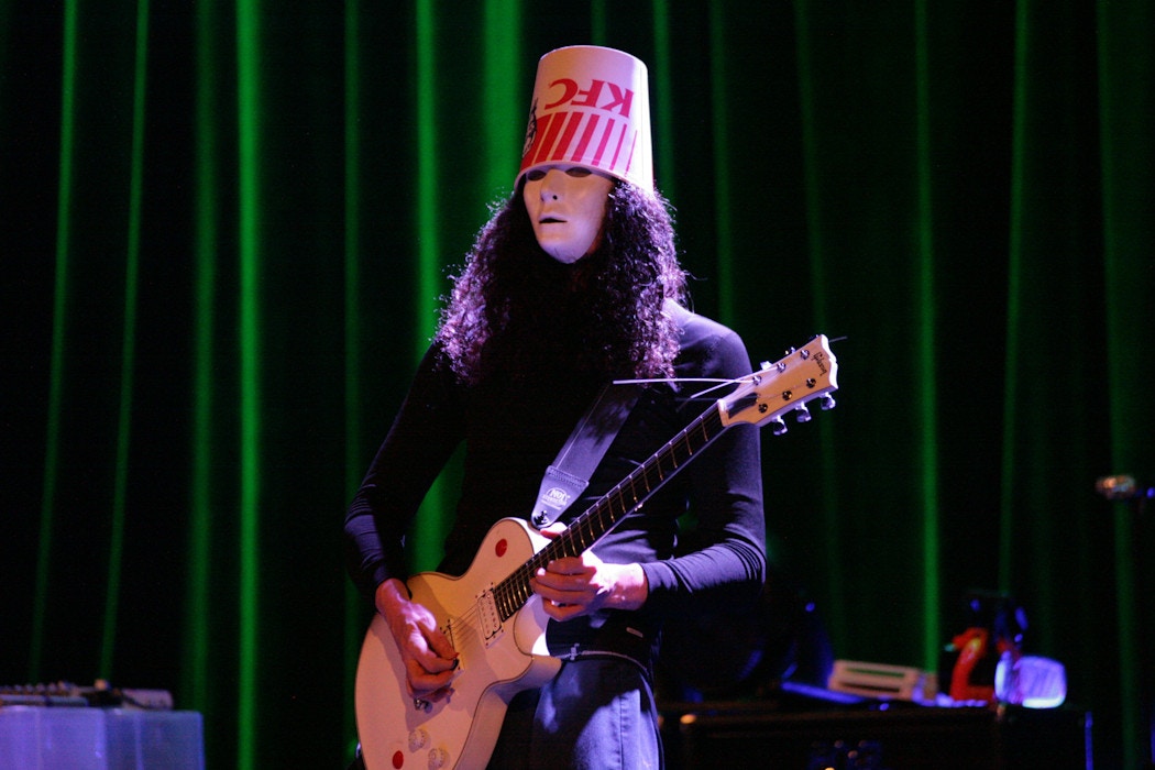 ▼當年美國知名蒙面樂手「桶頭」(Buckethead)在表演時,也經常在頭上戴著自製的 KFC 雞塊桶,如今看來他也是個時尚潮流的先驅!