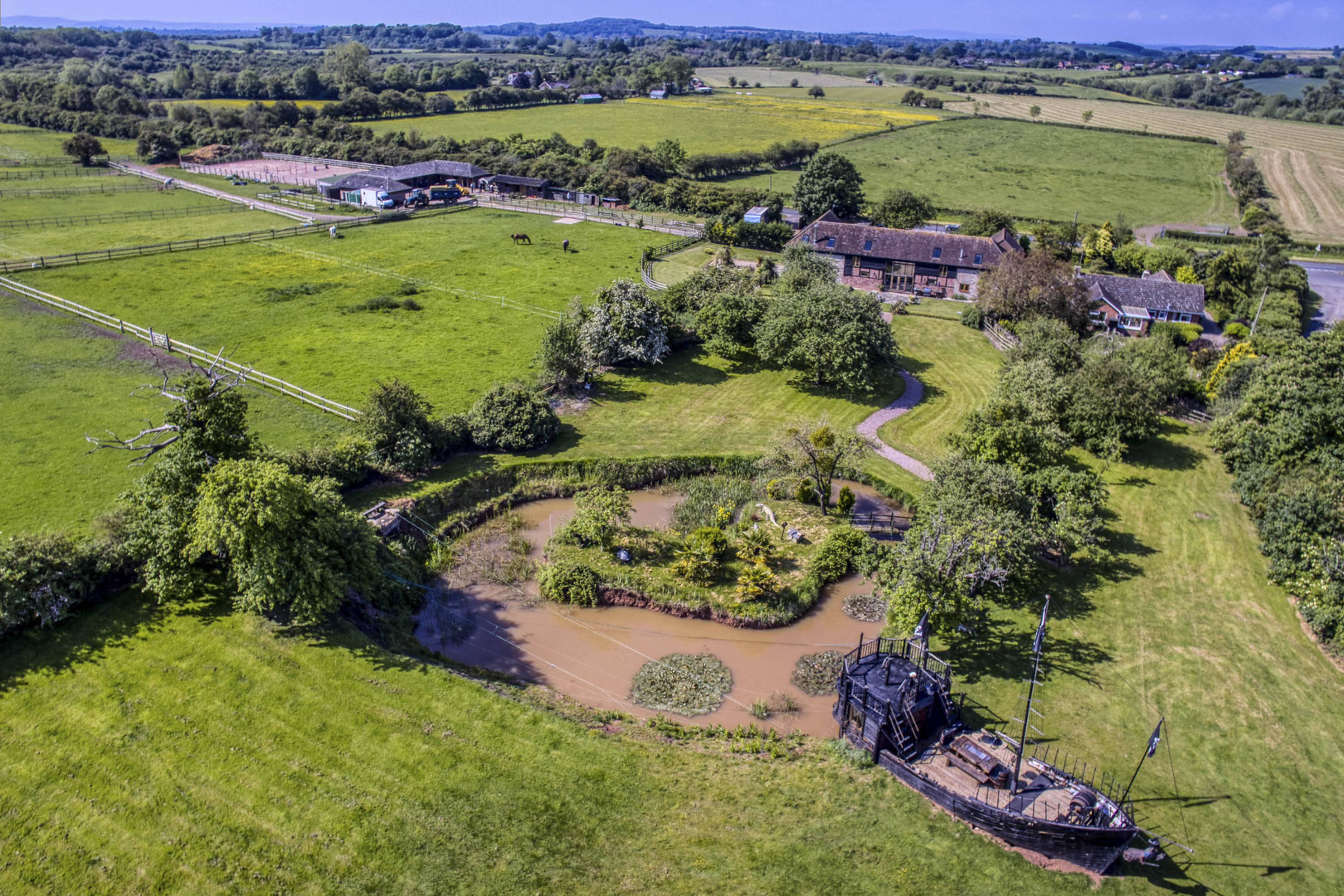 ▼除了這棟帶有卡丁車賽道的房屋,還有另一棟超酷的房屋正在出售。這棟位於格洛斯特郡的房屋有5間臥室,還有70多畝土地和11個馬廄。房主不僅建造了一個人工湖、湖心島,還建造了一艘海盜船。這艘船分為2層,裡面有酒吧。和朋友們在這裡喝酒、BBQ,都是不錯的選擇。